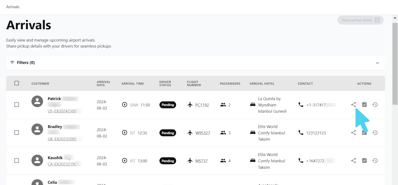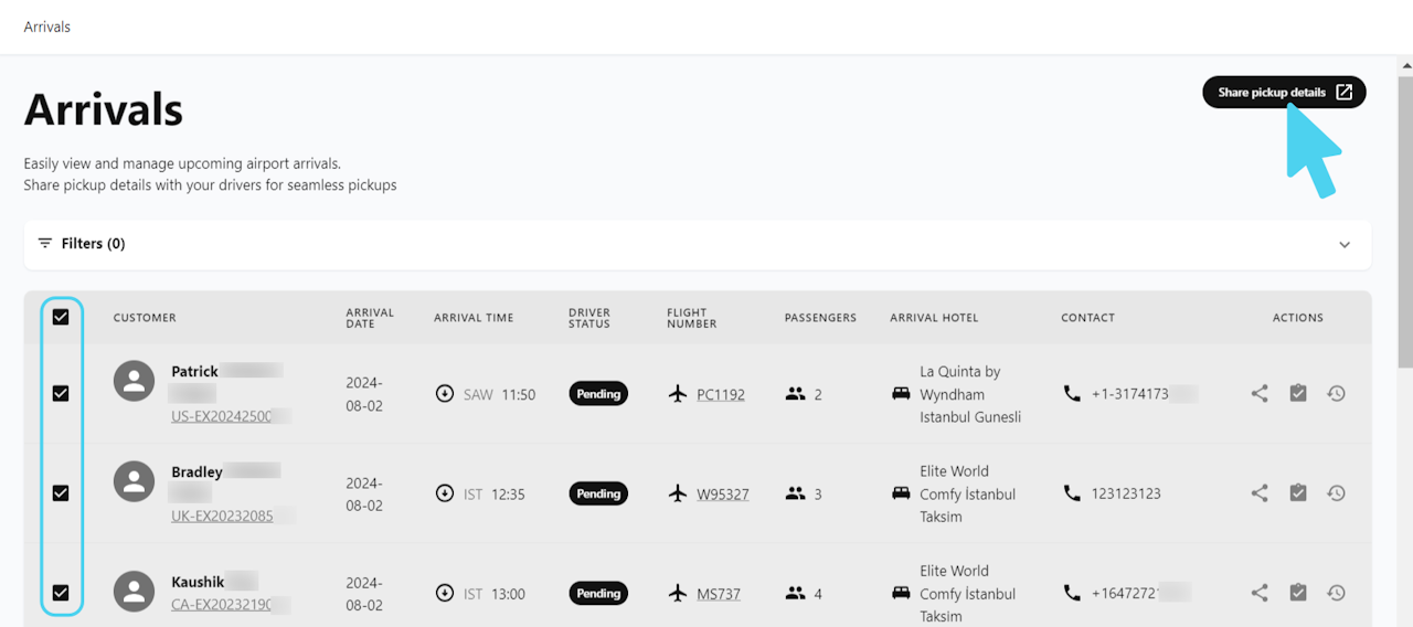 By selecting several, or all arrivals, you can generate a link using the "Share pickup details" button and send it to your drivers.