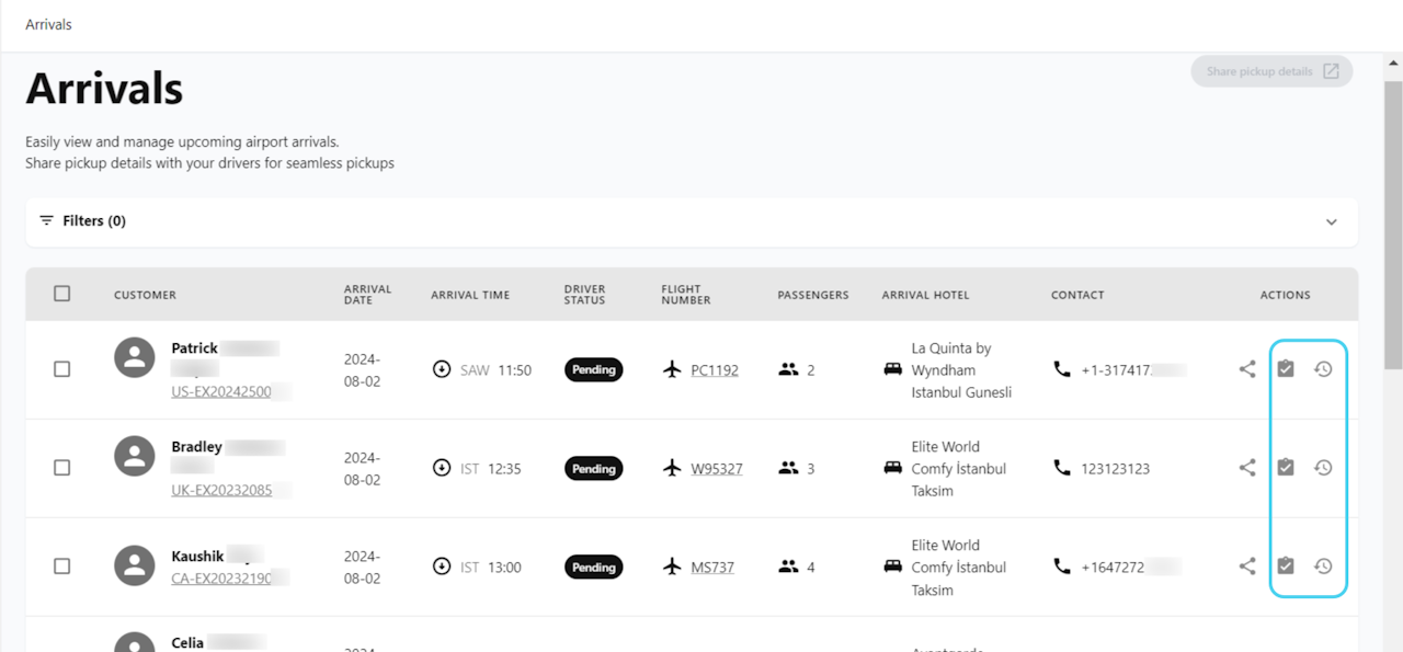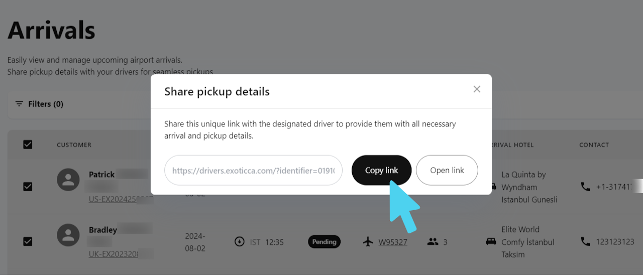 Generating a link for a single booking: In the “Actions” part of the list of arrivals, In the “Actions” section of the arrivals list, click on the first icon to generate a link specifically for that booking's pickup. This link will display information only for that particular booking (see second picture).