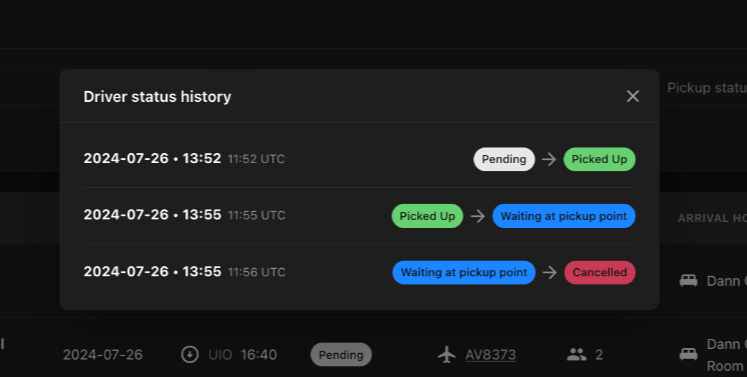 The third icon will show you a history of the pickup status changes for the booking. Please note that the times are displayed in both the flight's local time and UTC. (see second picture).