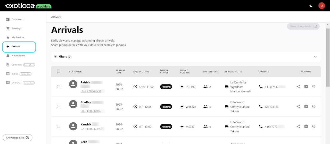The Arrivals section is designed to support and provide greater control over the meet and greet process for our clients upon their arrival at the airport. This phase is crucial to their journey, as any issues here can significantly impact their overall travel experience. To achieve a high percentage of successful pick-ups upon client arrivals, we developed this section, together with the Drivers App we will see later.