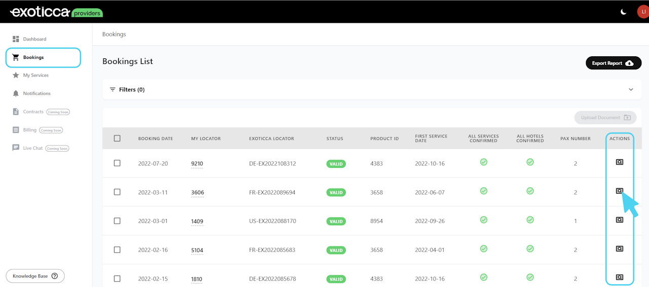 In the Bookings section, where you will find the list of your bookings, you can access each booking information and details by clicking on the loupe icon in the column "actions".