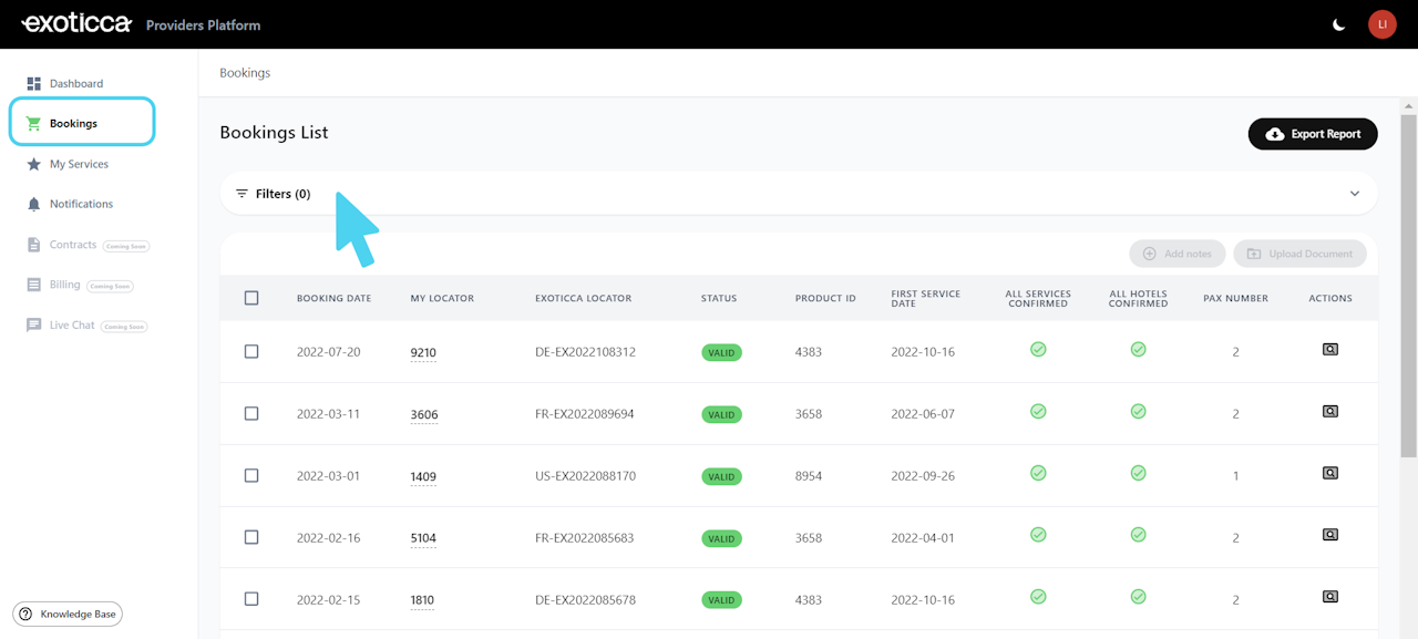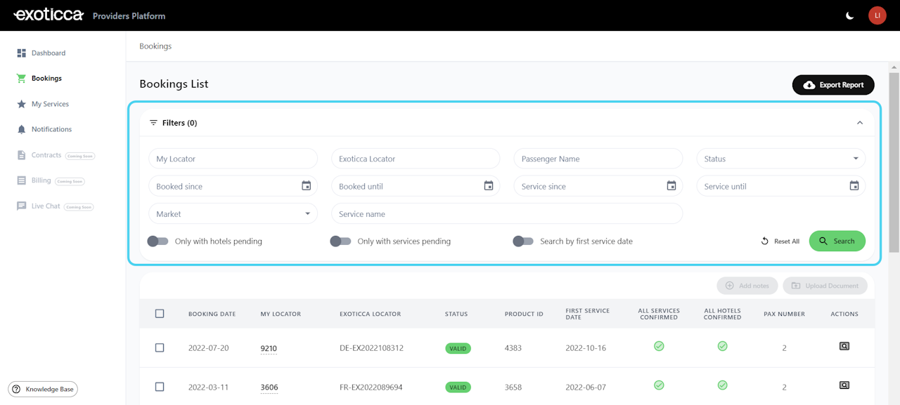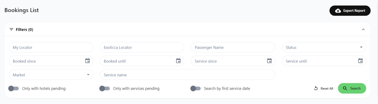 You can use filters to find your reservations or a list of them by Your Own Locator, Exoticca Locator, Passenger Names, Status of the booking, Dates of booking creation, Dates of services, Market and Service name*.