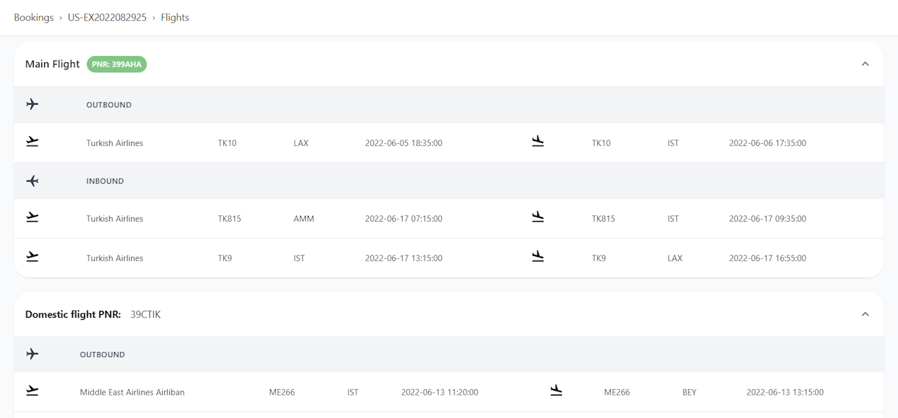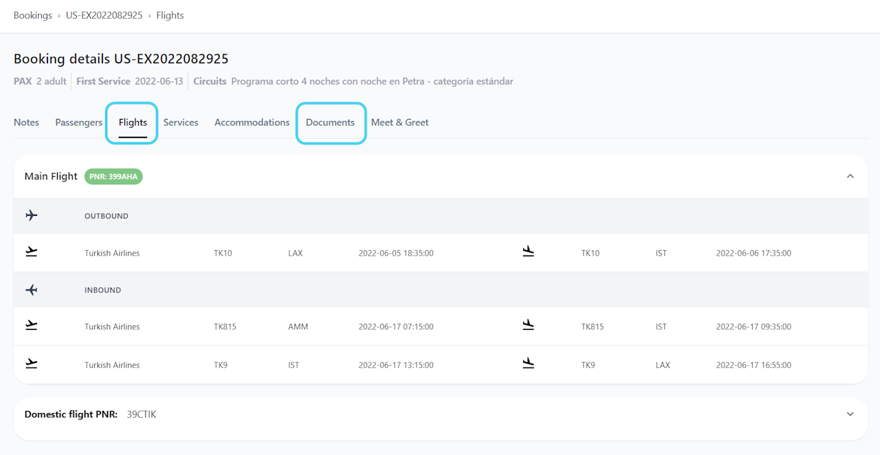 If a booking has a flight document/PDF in the "Documents" section, the document takes precedence over the information in the "Flights" section. Please, refer to the document for the most up-to-date information, as the details in the "Flights" section may not be updated.
