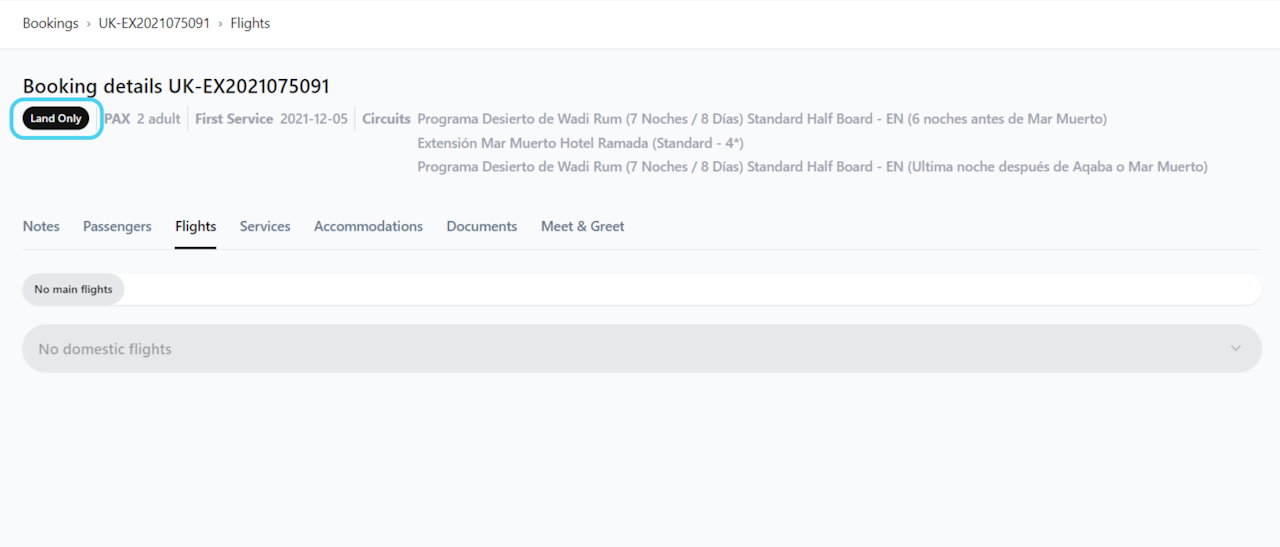 If the booking is a Land Only booking you will se a Land Only label when entering the booking and there will be no main flights in Flights section.