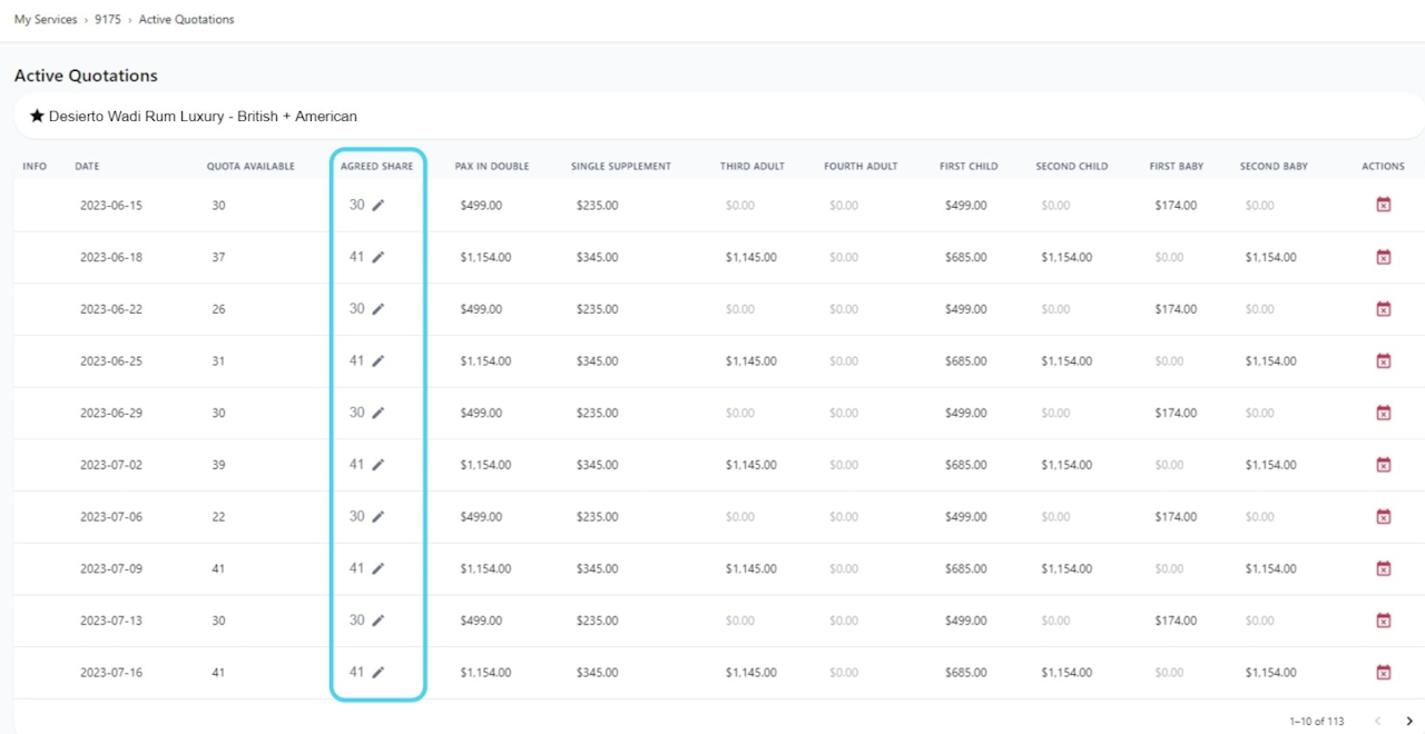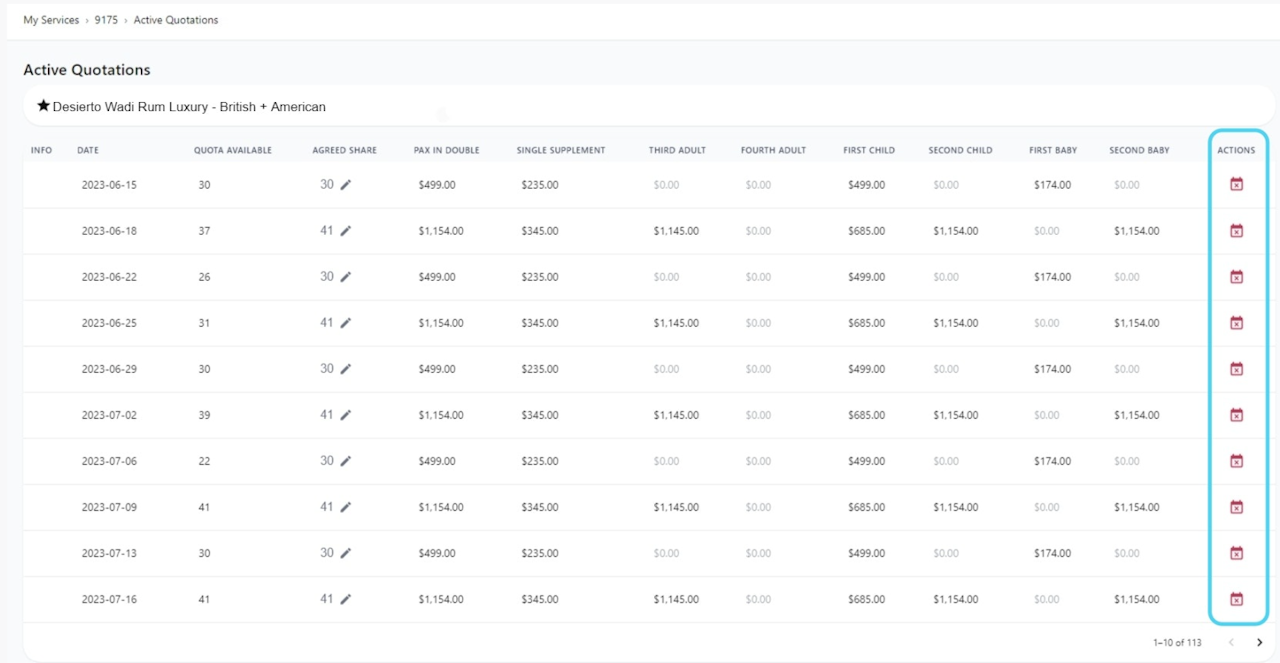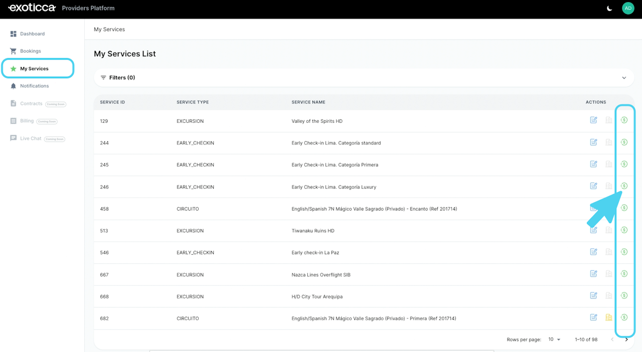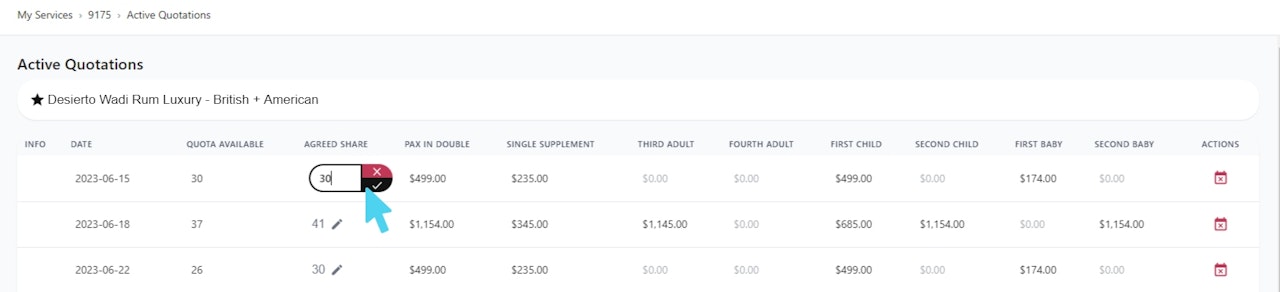 Go to "My services" and click on "Active Quotations" of the service you need to see all the available departures we have uploaded in our system (Remember you can use filters to find the services you want to edit).