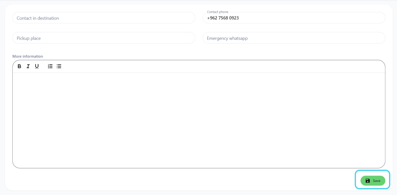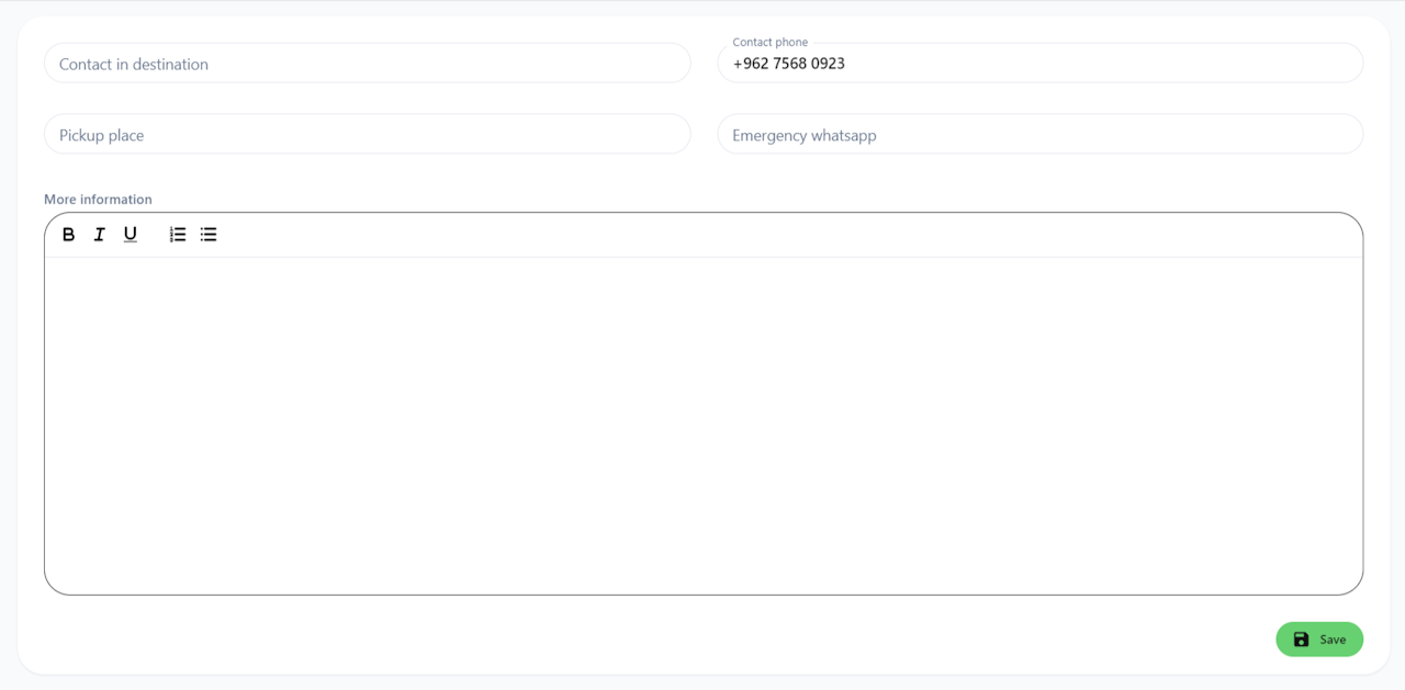 This section is for better inform our customers about the pick-up place and contact numbers at destination (when they arrive).