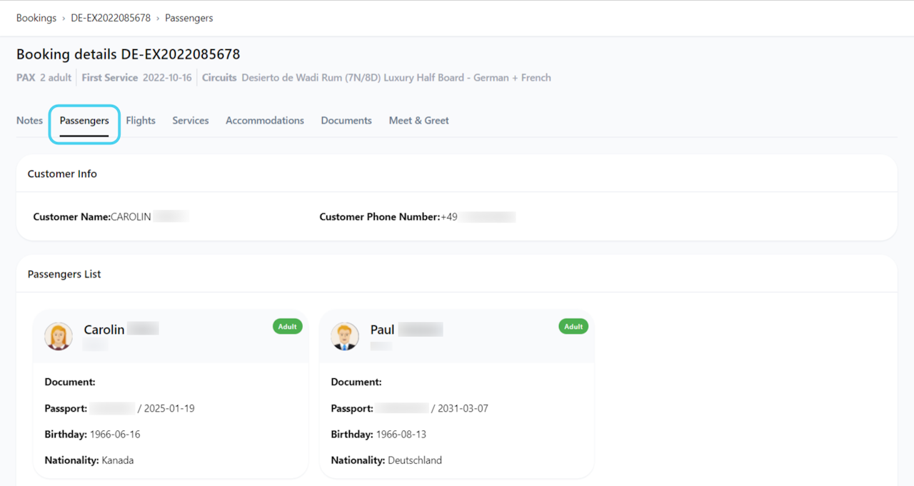 Passenger list: people travelling in the reservation (name, document, date of birth and nationality).